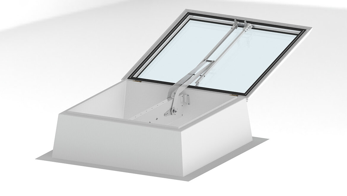 Il nuovo Smoke Lift finestra per tetti piani F100 coniuga i vantaggi dell’elemento in vetro F100 CI-System con quelli di un RWG elettrico secondo UNI EN 12101-2.